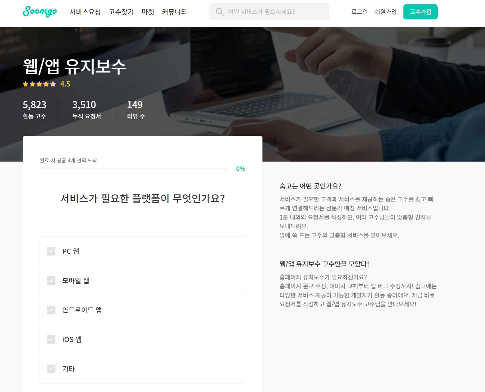 숨고에서도 IT프로젝트에 대한 고수를 찾을 수 있습니다. 내가 원하는 프로젝트 조건에 대해 입력하면 그 조건을 바탕으로 고수(에이전시 업체)가 쪽지로 회신주는 방식입니다. 신속하게 답장이 오는 경우는 자동답장인 경우가 많아 세부적인 조건은 업체와 세부 연락이 필요한 경우가 있습니다.