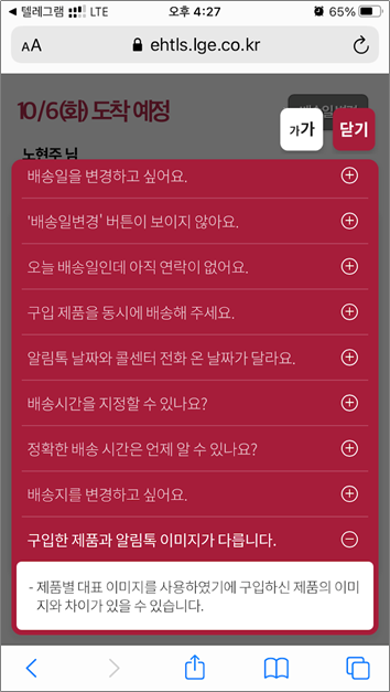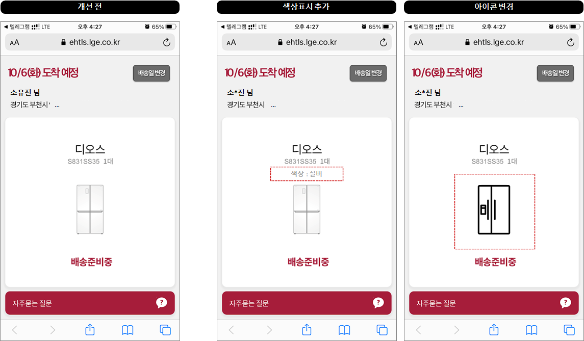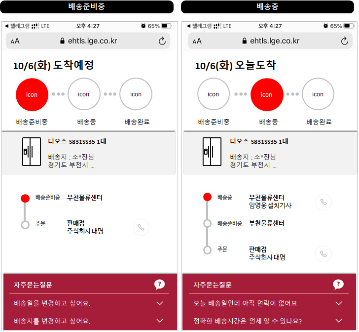 배송예정상태에서는 배송일과 배송지 변경에 대해서 제일 궁금할텐데,